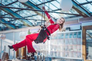 Letzten Sonntag war ich als fliegende Saxophonistin gemeinsam mit einem ebenfalls fliegenden tango-tanzenden Pärchen im Cremon Glashaus in Bargteheide. Hier planen wir eine ganze Reihe von Dinner-Shows, bei denen wir mit Live-Musik und Tanz von den Decken abgeseilt werden und für unvergessliche Abende sorgen dürfen. Aber auch Hotels, Kaufhäuser, größere Firmen, die ihre Mitarbeiter und Kunden mit etwas ganz Besonderem beeindrucken möchten, buchen uns. Hier sitze ich nicht nur auf einer Schaukel unter dem Dach, sondern schwebe auf Fensterbänken in 15-20 Meter Höhe, um mit einem langen Kleid und einem glänzenden Saxophon für Live-Musik und Augenschmaus zu sorgen. Ich selbst bekomme immer Gänsehaut, wenn ich die Blicke der Gäste sehe und freue mich auf jeden Auftritt als fliegende Saxophonistin wie ein kleines Kind.